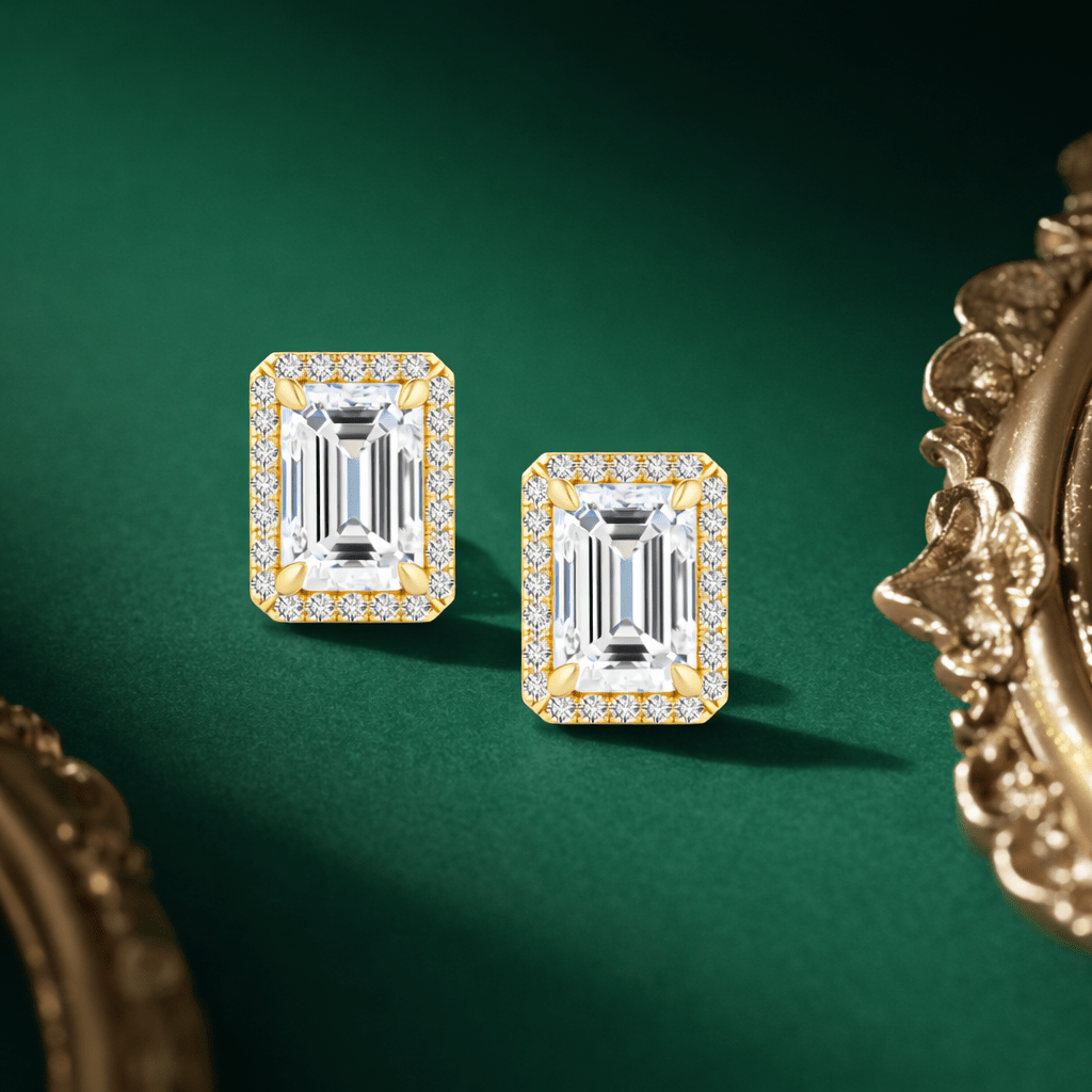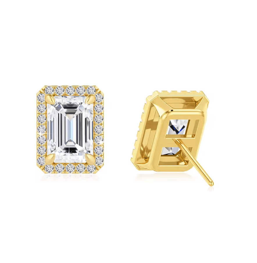 Veruska - 2CTW Emerald Cut Moissanite Halo Stud 14K Yellow Gold
