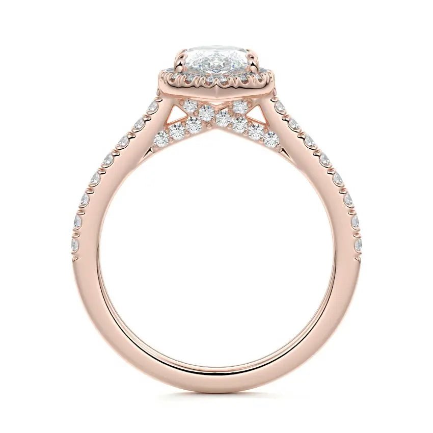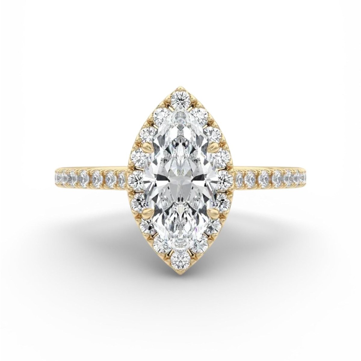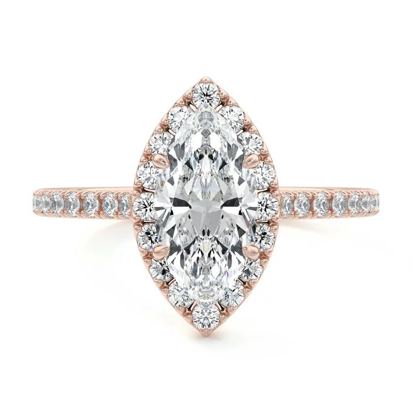 Capture the spotlight with a slender, elongated marquise center stone framed by a delicate halo of brilliant pavé. The iconic marquise cut elongates the finger and maximises fire, while the halo intensifies sparkle—perfect for the modern romantic.